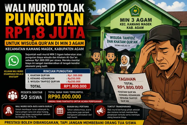 Buliran.com | Agam - Polemik dugaan pungutan Rp1,8 juta untuk kegiatan wisuda tahfidz dan khatam Al-Qur’an di MIN 3 Agam terus bergulir dan kian menyita perhatian publik. Namun di tengah sorotan tersebut, sikap Kepala Sekolah justru menambah tanda tanya.